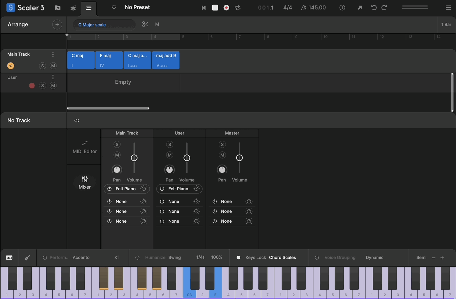 - User Track lets you record directly into Scaler’s piano roll, capturing melodies, chords, and ideas in real time. Record chord triggers to build your own rhythmic sequences or capture your Keys Lock performances as editable MIDI. Chord, scale, and note guides keep everything harmonically grounded, and full MIDI editing lets you refine your performance quickly.