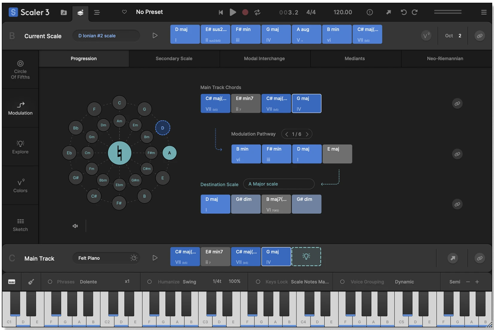 Solve your modulation puzzles with Scaler’s suggested pathways. Choose a destination scale and Scaler will offer multiple ways to reach it. You’ll also find Modal Interchange, Mediant and Neo-Riemannian modulation methods here too. Use the Circle of Fifths to explore related chord substitutions and variations that expand your harmonic options.
