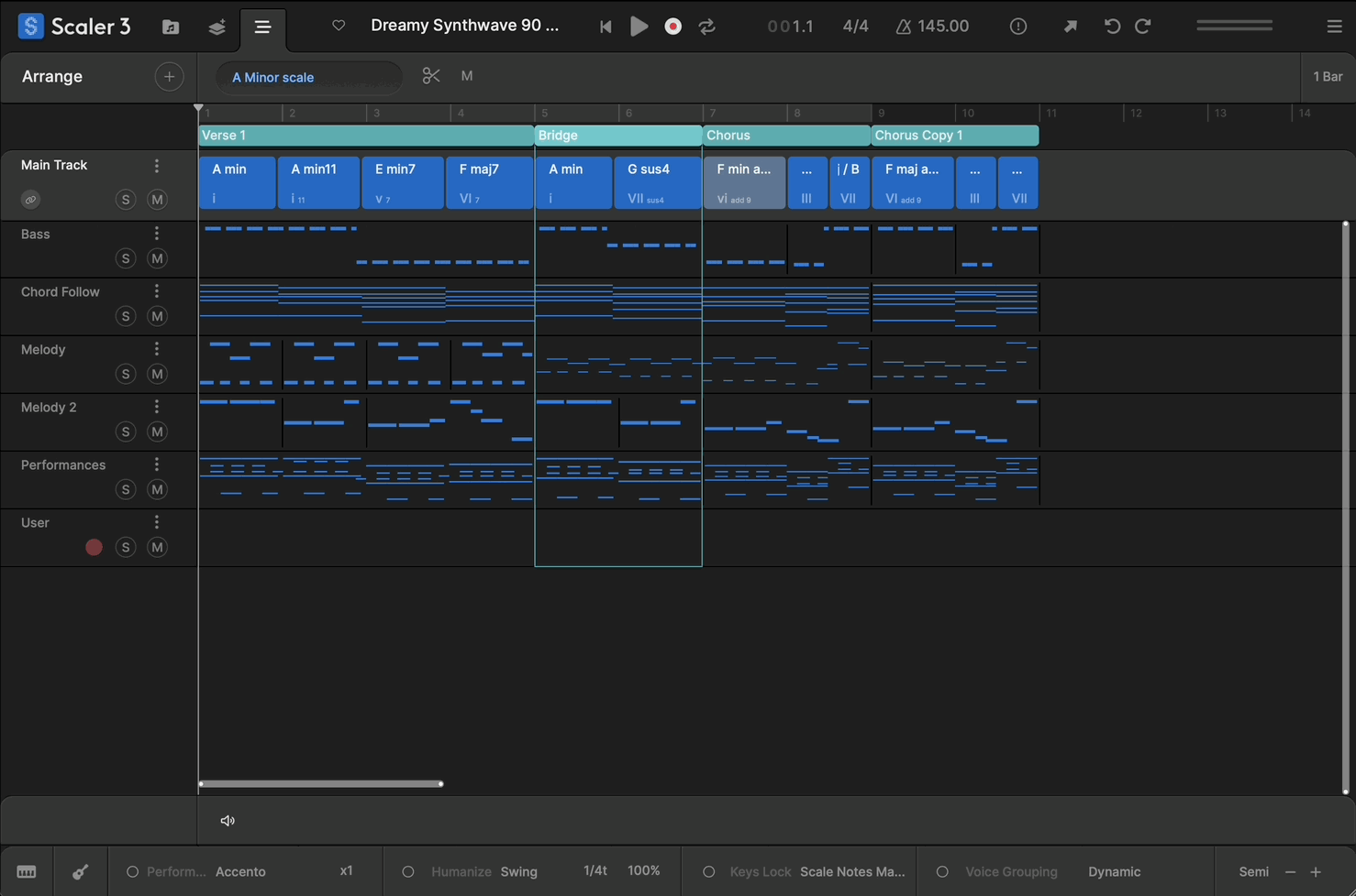 - New in Scaler 3, the Bass Follow Track automatically follows the root note of your chord track, creating a dynamic bassline. Use the Inversion modifier to send voices to different instruments.