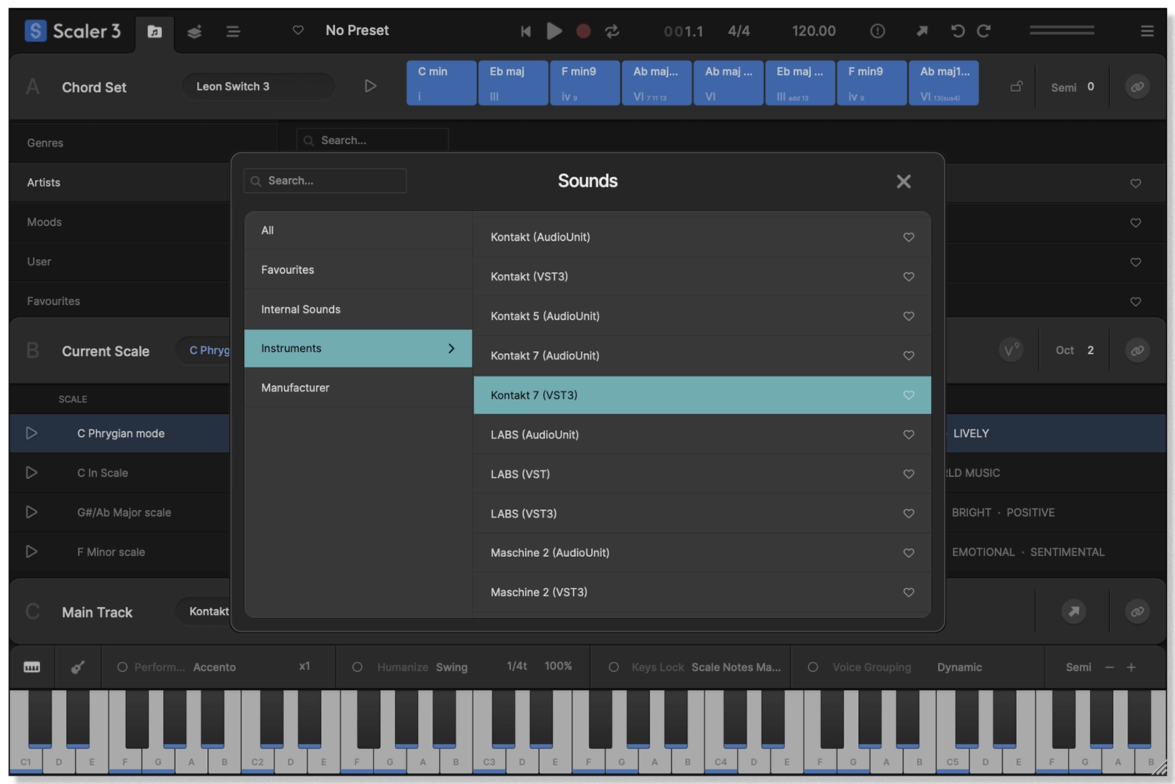 - 50 internal sounds (including pianos, synths, and orchestral instruments) let you play your progressions, or you can load VST/AU plugins for further sonic expansion.